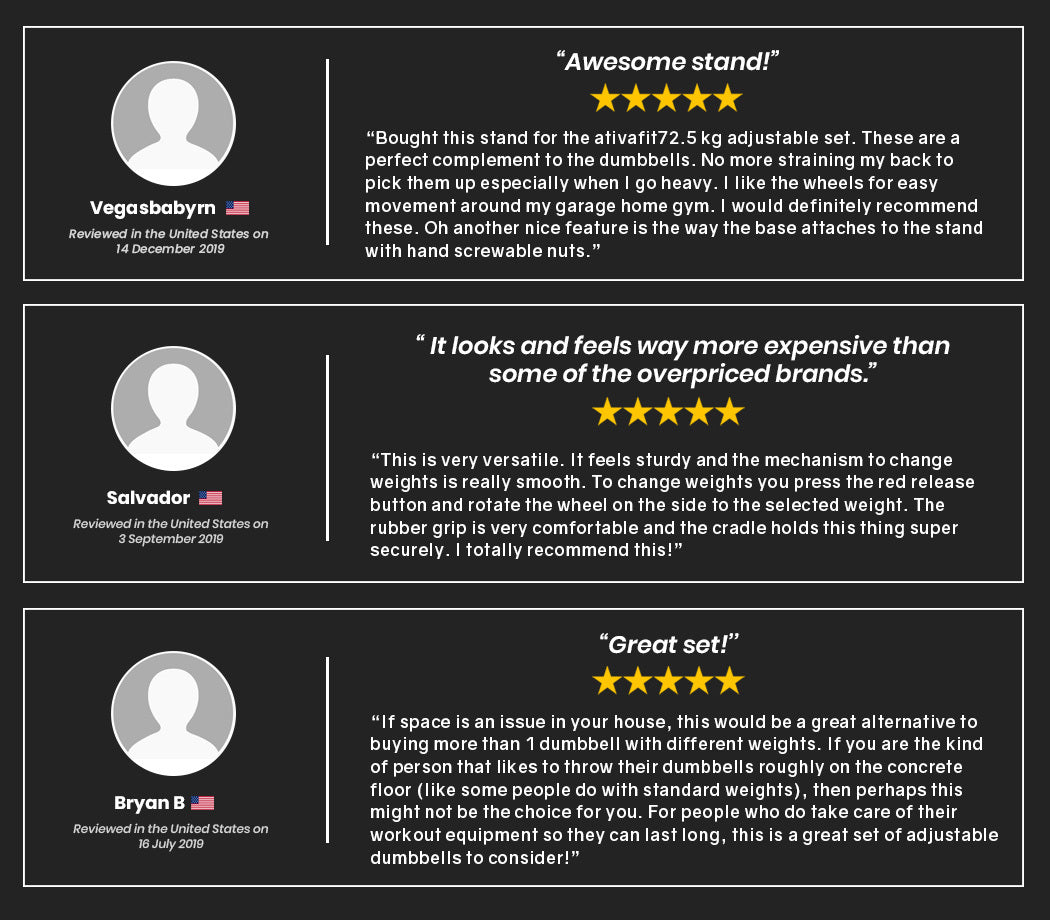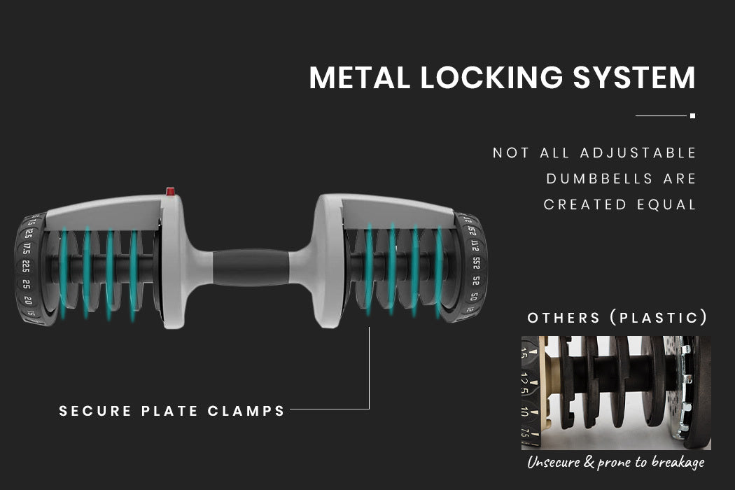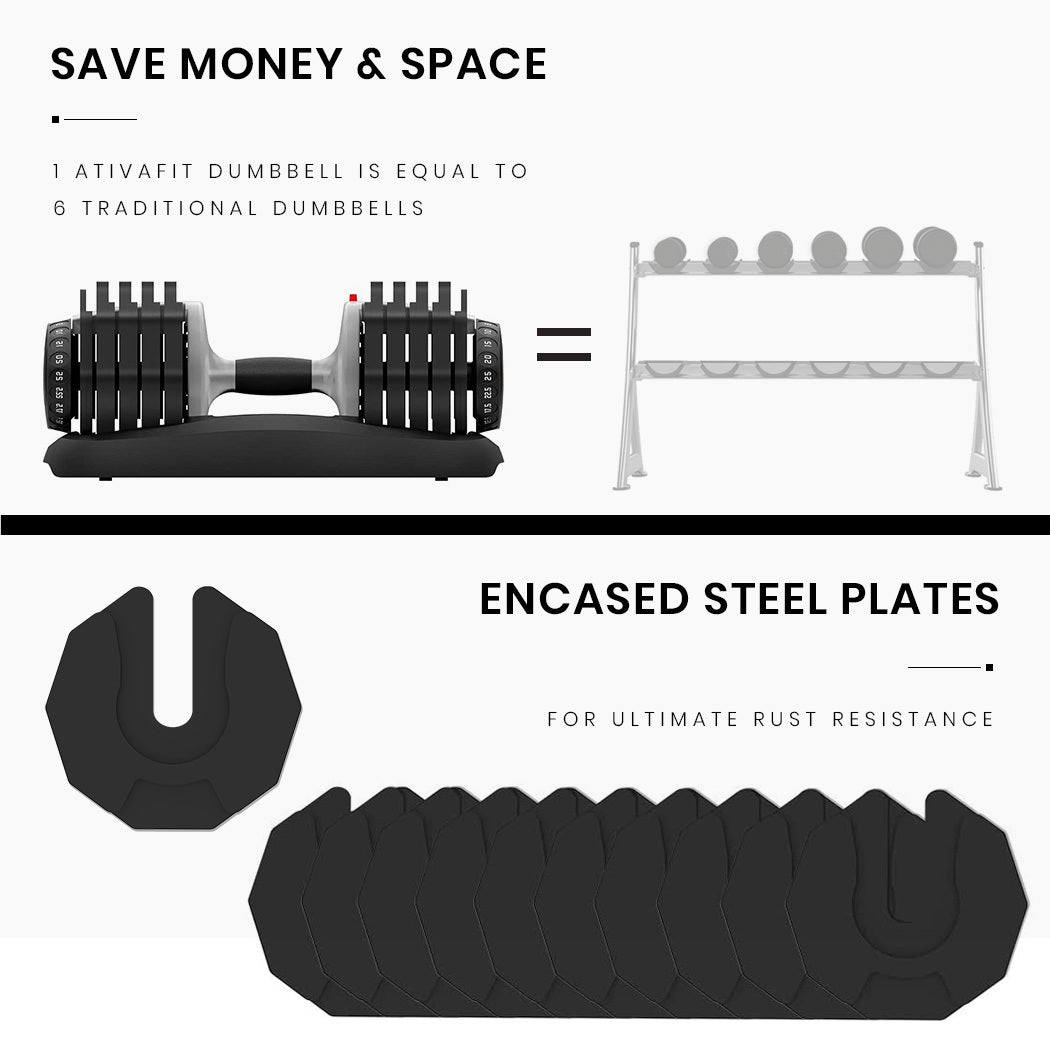 Giving you the versatility of 6 sets of standard dumbbells, your Ativafit® set saves you on the initial outlay cost as well as being much more compact to store! With superior design and build quality, it should come as no surprise that Ativafit® are leaders in the U.S. market. While other adjustable dumbbell models have a plastic locking system, Ativafit® employs a secure high-tensile steel design. Comfortable and secure grip control is provided by the contoured soft grip handles.