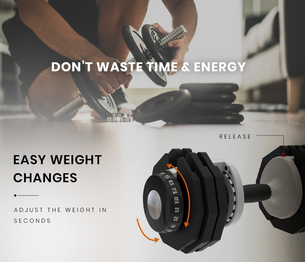 Each muscle group requires a different weight, and with your Ativafit® dumbbells, you can select just the right amount in seconds. You can literally put your progress on speed dial. Simply twist the secure lock-in dials and select the desired weight within seconds. Any remaining weights will be left in the base plate.