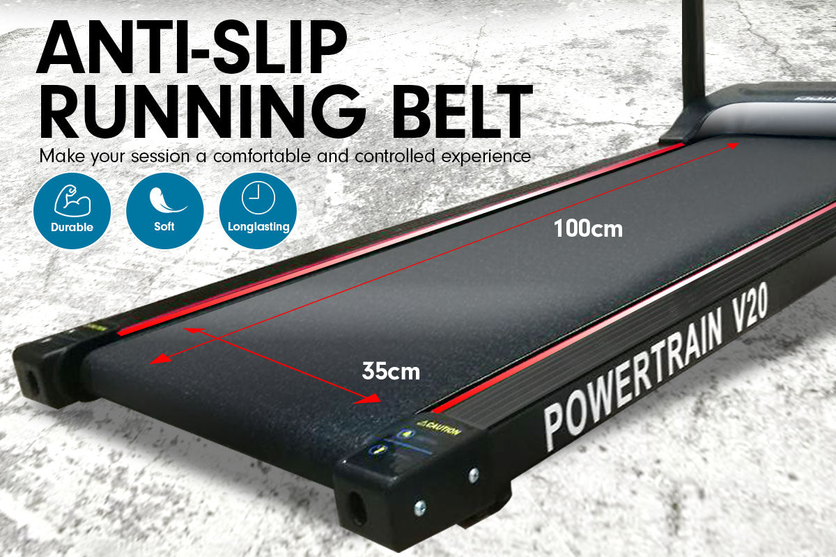 Powertrain V20 foldable treadmill is manufactured with keeping home fitness regime in mind to make indoor workouts much easier and effective with easy to use design. The spacious tread belt is perfect for running or walking comfortably.