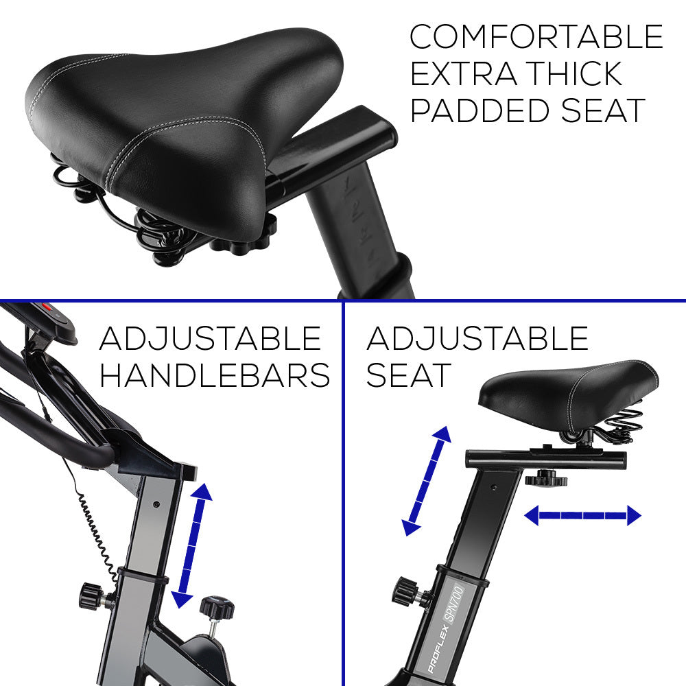 The New PROFLEX® SPN700 Spin Bike is the perfect way to get commercial grade fitness equipment into your home. This state-of-the-art unit has been designed to include the best quality features for spin cycling. While other spin bikes used in home gyms typically feature a low-grade flywheel, PROFLEX have incorporated a heavy stainless steel commercial flywheel. This is beneficial because it creates a smoother, more realistic sensation of riding compared to inferior alternatives.